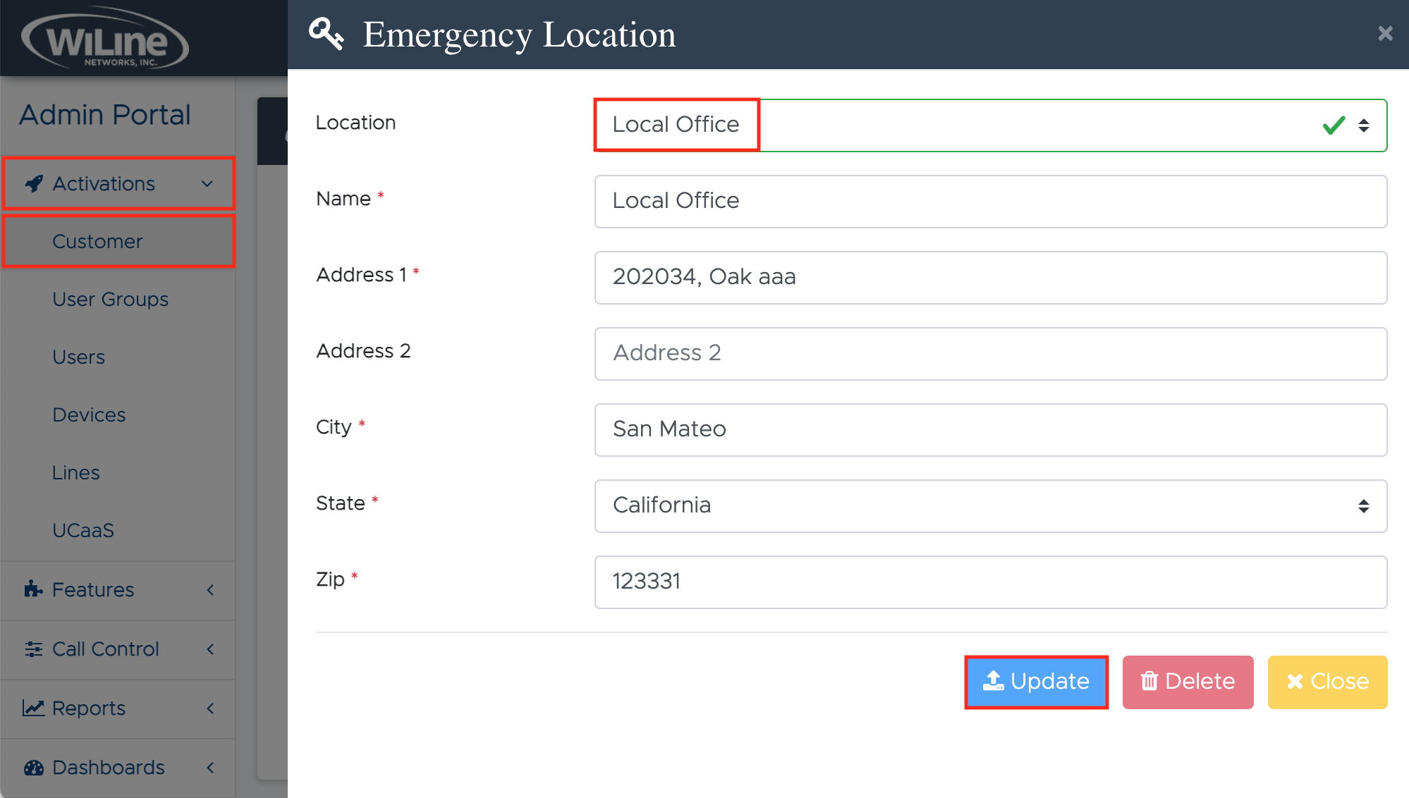 Locations are preconfigured by a WiLine UCaaS Admin.