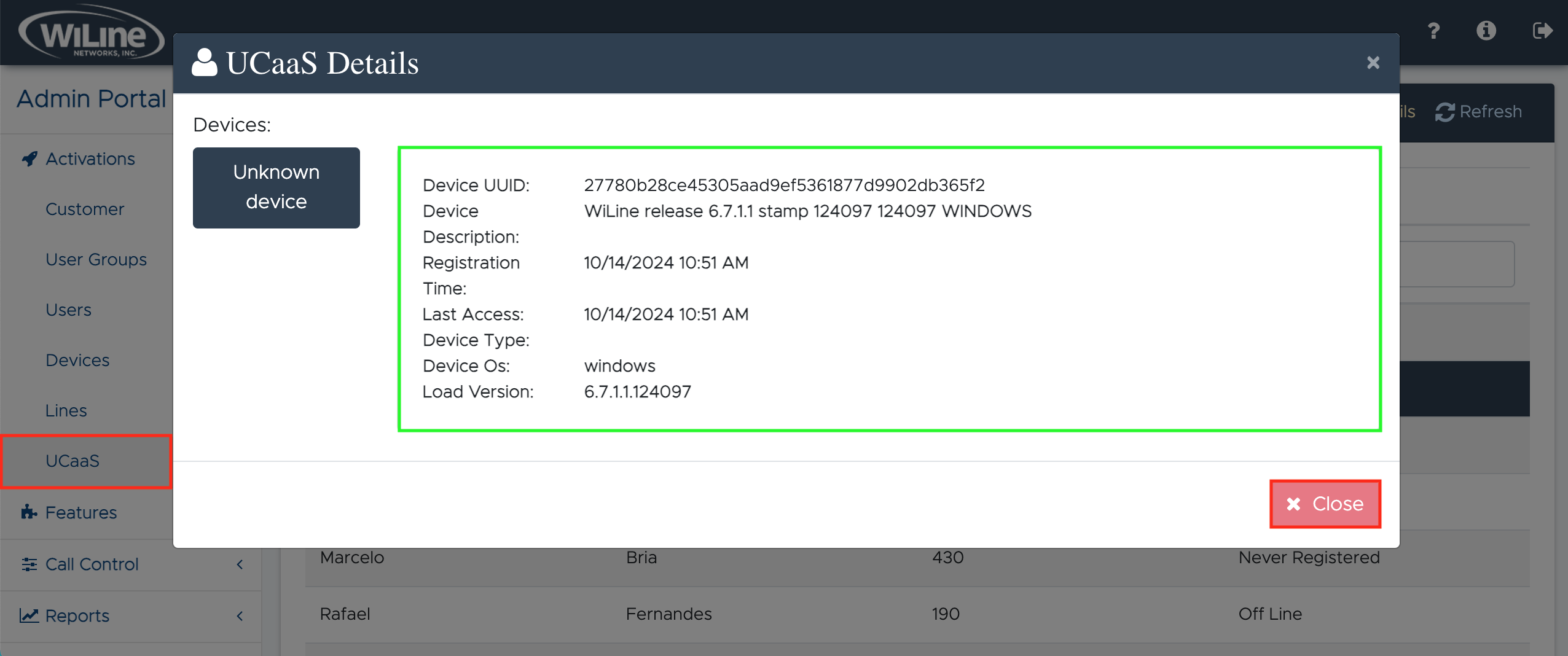 An UCaaS Details pop-up will open, allowing you to view user-specific details: