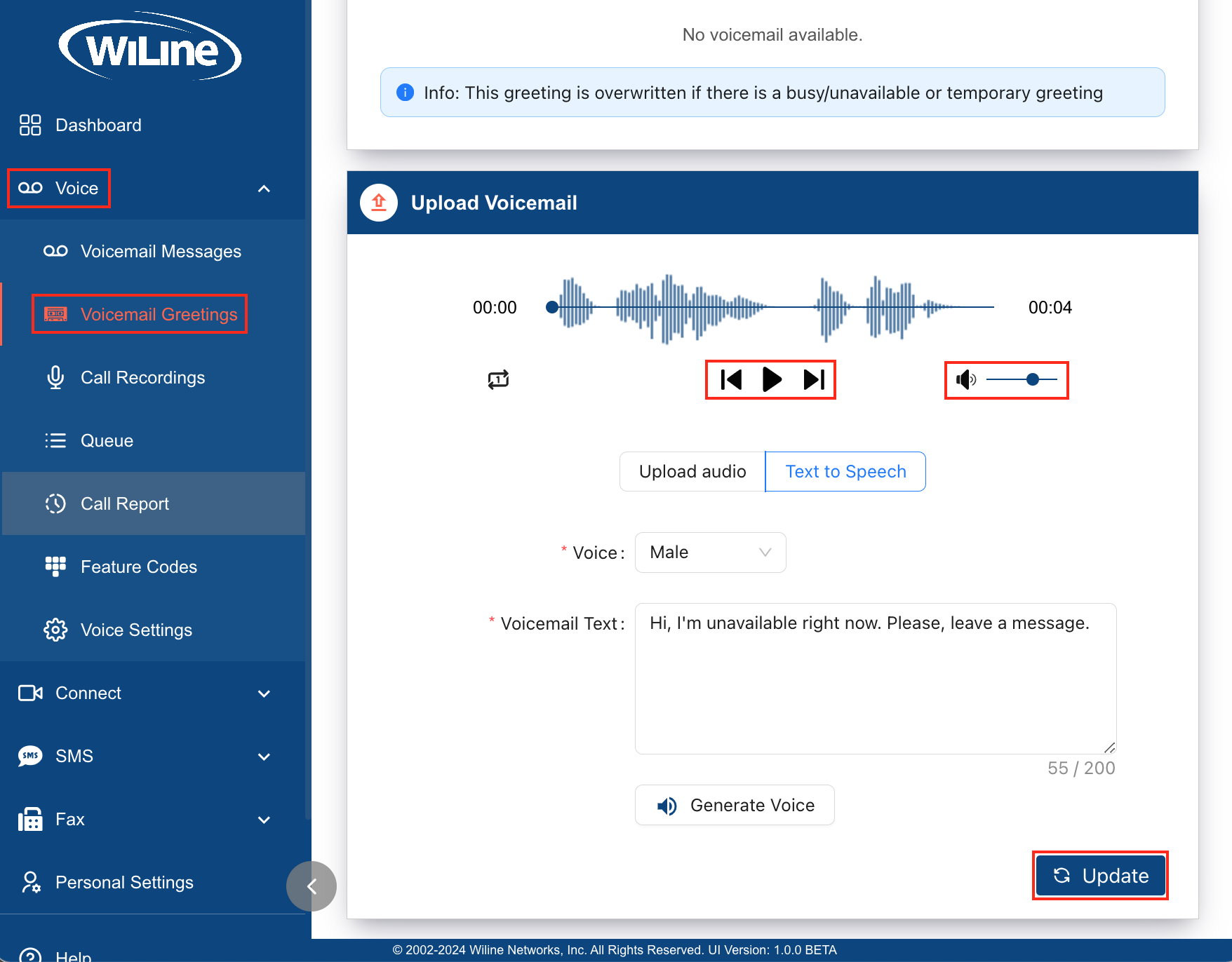 - En el menú del lado izquierdo, navegue a Voice > Voicemail Greetings.